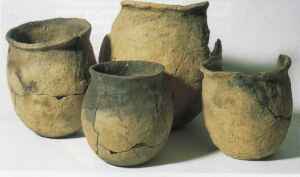 Anhand der mannigfachen Keramikfunde stellte sich schnell heraus, daß sich auf diesem Areal zwei Siedlungshorizonte überlagert haben. Der ältere datiert in die Jahrzehnte vor und nach der Zeitenwende. Es handelt sich also um Überreste einer älterkaiserzeitlichen Geestrandsiedlung, die an diesem Standort wohl nur wenige Generationen überdauerte. Die überwiegende Zahl der Befunde wird allerdings in das frühe Mittelalter gehören, wofür die wiederholte Auffindung sog. Eitöpfe spricht (Abb. 1). Den Namen verdankt diese Keramik ihrer etwas plumpen, leicht bauchigen, insgesamt wenig gleichmäßigen Form. Auch die Ränder sind wenig präzise hergerichtet, die Böden sind sog. Wackelböden, die nicht wirklich gerade, aber auch noch nicht rund wie die der späteren Kugeltöpfe sind. Der Ton für die Eitöpfe wurde mit grobem Gesteinsgrus gemagert, sie sind dickwandig und nur unregelmäßig unter wenig hohen Temperaturen gebrannt. Die Farben der Gefäße variieren zwischen braunen, grauen und schwärzlichen Tönen; vereinzelt zu beobachtende Rußspuren zeigen an, daß sie auch als Kochtöpfe gebraucht wurden.